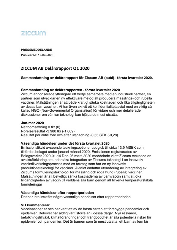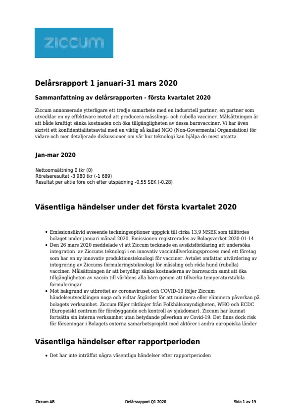 Emissionslikvid avseende teckningsoptioner uppgick till cirka 13,9 MSEK som tillfördes bolaget under januari månad 2020. Emissionen registrerades av Bolagsverket 2020-01-14 Den 26 mars 2020 meddelade vi att Ziccum tecknade en avsiktsförklaring att undersöka integration av Ziccums teknologi i en innovativ vaccintillverkningsprocess med ett företag som har en ny innovativ produktionsteknologi för vacciner. Avtalet omfattar utvärdering av integrering av Ziccums formuleringsteknologi för mässling och röda hund (rubella) vacciner. Målsättningen är att betydligt sänka kostnaderna av barnvaccin samt att öka tillgängligheten av vaccin till världens alla barn genom att tillverka temperaturstabila formuleringar