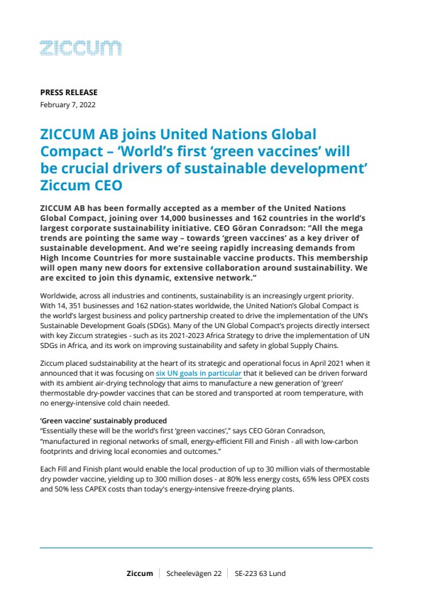 ZICCUM AB has been formally accepted as a member of the United Nations Global Compact, joining over 14,000 businesses and 162 countries in the world’s largest corporate sustainability initiative. CEO Göran Conradson: “All the mega trends are pointing the same way – towards ‘green vaccines’ as a key driver of sustainable development. And we’re seeing rapidly increasing demands from High Income Countries for more sustainable vaccine products. This membership will open many new doors for extensive collaboration around sustainability. We are excited to join this dynamic, extensive network.”