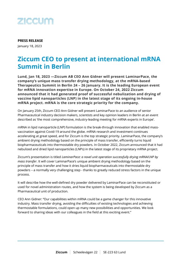 Lund, Jan 18, 2023 —Ziccum AB CEO Ann Gidner will present LaminarPace, the company’s unique mass transfer drying methodology, at the mRNA-based Therapeutics Summit in Berlin 24 – 26 January. It is the leading European event for mRNA innovation expertise in Europe. On October 24, 2022 Ziccum announced that it had generated proof of successful nebulization and drying of vaccine lipid nanoparticles (LNP) in the latest stage of its ongoing in-house mRNA project. mRNA is the core strategic priority for the company.