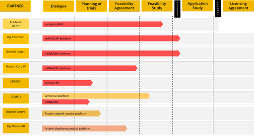 - For mRNA/LNP projects, where Ziccum has generated very important data recently, more advanced discussions now include one more US Biotech Corporation (Biotech IV) where feasibility study negotiations are reaching final stages; the parties have agreed on the scope of the work plan and are currently reviewing legal terms. The modality to be tested is mRNA in a partner specific LNP formulation, where organ targeting is an extra technology edge for the mRNA/LNP partner portfolio.